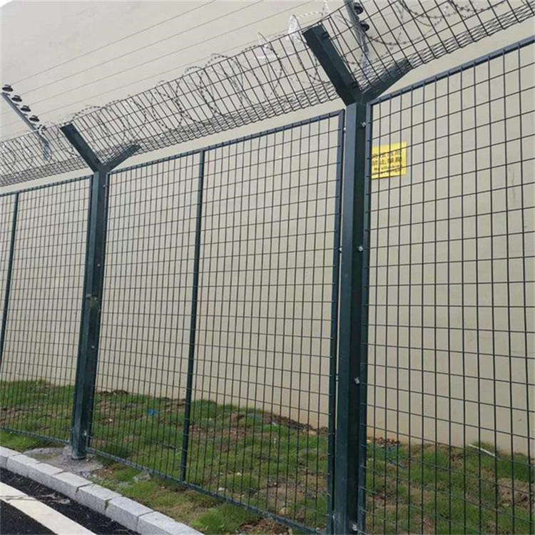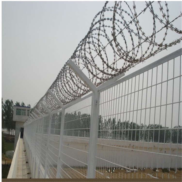 3、防攀爬v型网与蛇腹形刀刺网 防攀爬是监狱钢网墙必须必备的特点,我们一般会在监狱钢网墙顶端架设蛇腹形刀刺网。现在监狱架设的蛇腹形刀刺网型号为BTO-22型号,根据规定不同的地方架设的刀刺网圈经不一样,一般有φ50cm、φ60cm、φ80cm。 固定蛇腹形刀刺网,需要在钢网墙顶端行成一个V字型,一般有钢筋焊接V型网和拉线构成V型。架设的时候采用特定的卡扣、按照规定的间距进行安装就行。